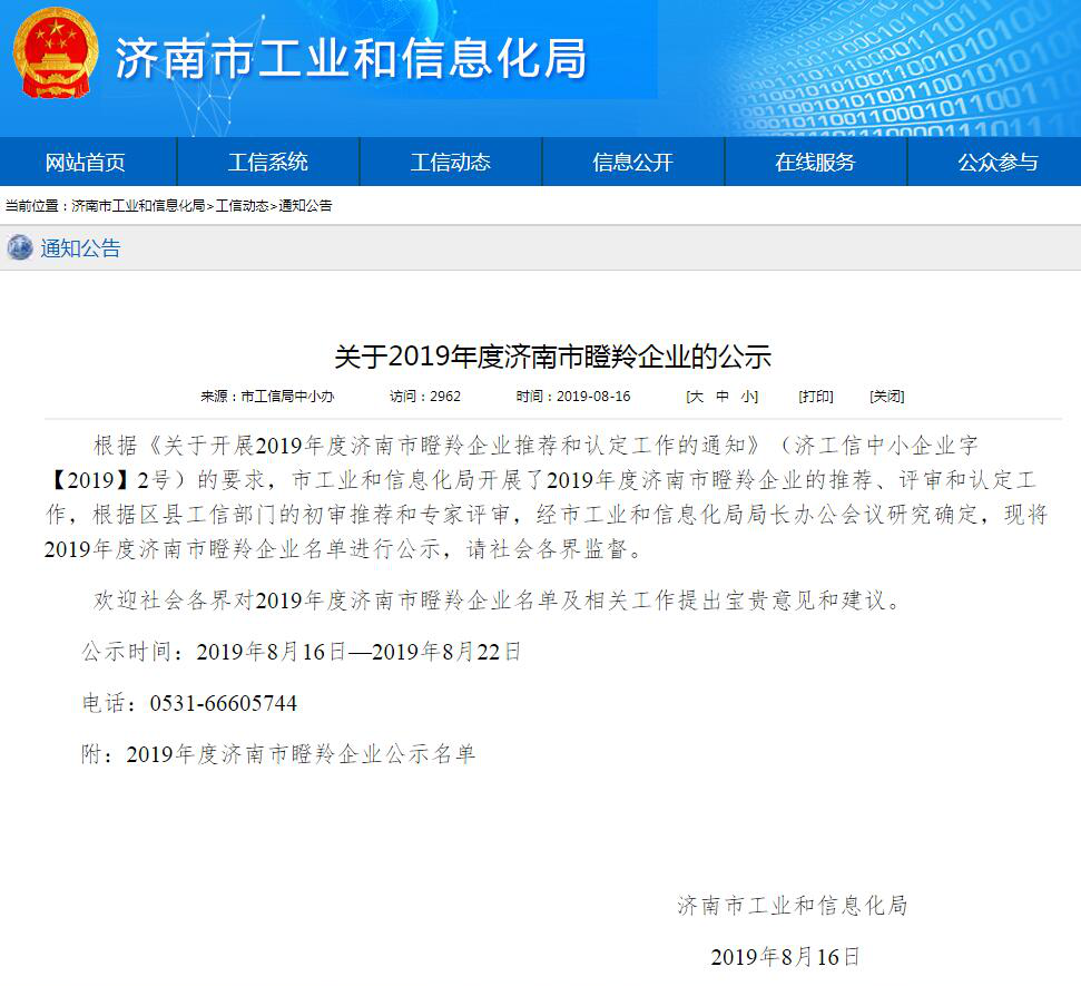 2019年8月16日济南市工业和信息化局网站消息:根据《关于开展2019年度济南市瞪羚企业推荐和认定工作的通知》(济工信中小企业字【2019】2号)的要求,市工业和信息化局开展了2019年度济南市瞪羚企业的推荐、评审和认定工作,根据区县工信部门的初审推荐和专家评审,经市工业和信息化局局长办公会议研究确定了济南市瞪羚企业名单,我公司成功入选。